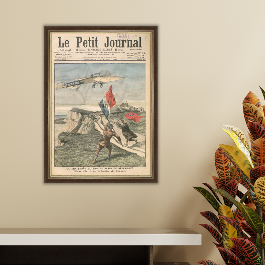 La Une du Petit Journal du 8 Aout 1909 présente l'exploit de l'aviateur Blériot qui réussi la traversée de la manche en aéroplane quelques jours plus tôt.